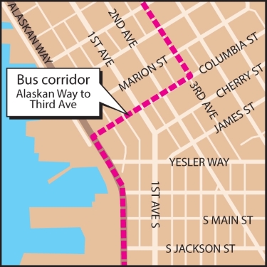 King County Metro and the city of Seattle will turn part of Columbia Street from Alaskan Way to Third Avenue into a two-way corridor for buses in fall 2020. This is designed to get West Seattle and Burien riders to and from downtown when the viaduct comes down.
