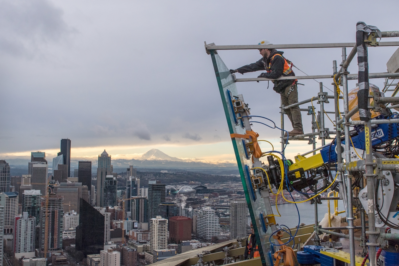 Hoisting the giant glass panels to the observation deck takes some doing, since they're too big for the Needle's elevators. Each 11-by-7-foot panel is 2.5-inches thick and weighs a hefty 2,300 pounds. A fitted steel shoe adds another 200 pounds.