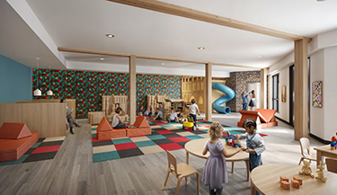 Another place for children to play and interact is the indoor kids' active room. It is positioned next to a small adult gym so parents can supervise while working out. Also planned are co-working cubes along the perimeter so parents can even (try to) work while the kids play.