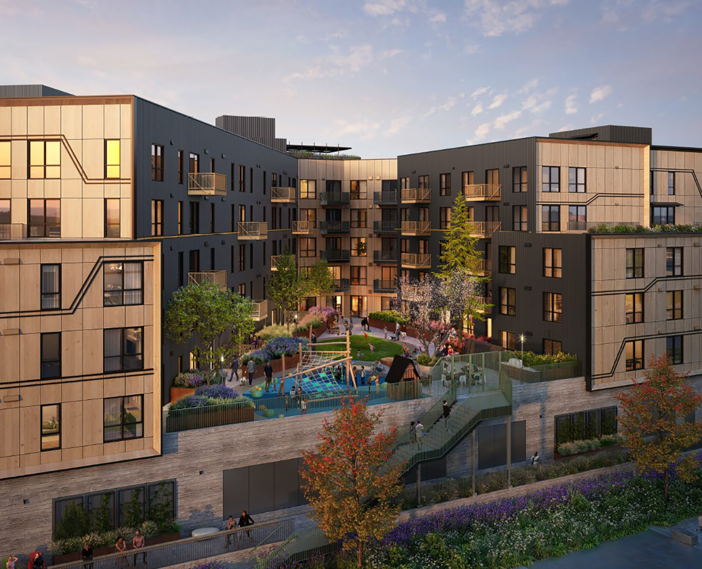 An outdoor courtyard is being built on top of the parking podium with residential units opening onto it, creating a neighborhood of sorts for families to interact. The courtyard includes a playground.