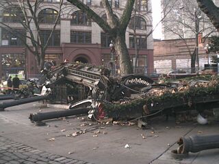 SEATTLE (AP) — The historic iron and glass pergola at Pioneer Square, a national historic landmark and one of the city's most famous meeting spots, was knocked over by a truck and smashed into pieces early Monday.