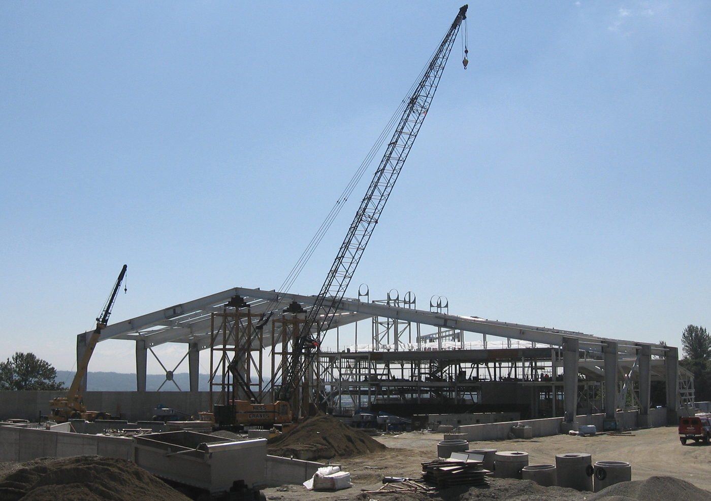 Lydig Construction crews are installing the main girders of the high-bay section of the new Bow Lake Recycling and Transfer Station adjacent to Interstate 5 in Tukwila. The project's construction costs are about $43 million.
