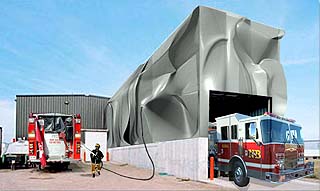 The Hydro Wall would store rainwater that could be injected into fire truck tanks, or used as gray water for toilets or cooling systems. |