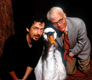An animatronic swan claims a starring role in Seattle Opera's production of Wagner's "Lohengrin." With the swan are "Lohengrin" director Stephen Wadsworth and Seattle Opera general director Speight Jenkins.