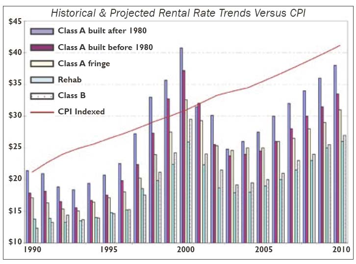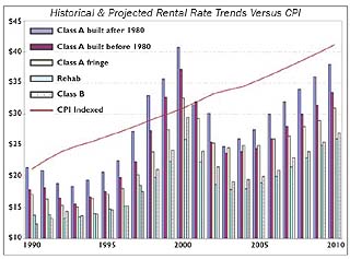 Rental rate growth Experience tells us that when a market recovery hits, rental rate increases can be spectacular. By the same token, the re-emergence of a market where new construction is economically feasible can be spectacularly short, largely on account of the nature of the business cycle, but also due to parallel development. It is taken for granted especially for high-rise real estate which takes years to develop that the economic conditions that precipitate new development are often markedly different than those at the time of product delivery. This makes it difficult to plan projects to appear when they are really needed, and even more difficult to stop their delivery from occurring in times when they are not. Lincoln Square and Bellevue Technology Tower are examples of the fallout associated with being on the wrong side of the curve. So just where are investors projecting rental rates will be in the next few years? By most projections, resumption in stabilized conditions won't be a quick turn-around. However, recognizing that rents will rise as conditions become more favorable, most investors are expecting significant gains in rental rates in the latter half of this decade. Our own modeling calls for increases on the order of 50 percent or so over the next six years once again allowing the Class A space average to come close to $40 per square foot.