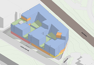 On a sloping site, three levels of structured parking would have around 467 stalls. And some 7,700 square feet of retail is proposed on 116th. Units run from large studios, with 630 square feet, up to three-bedrooms with 1,387 square feet.