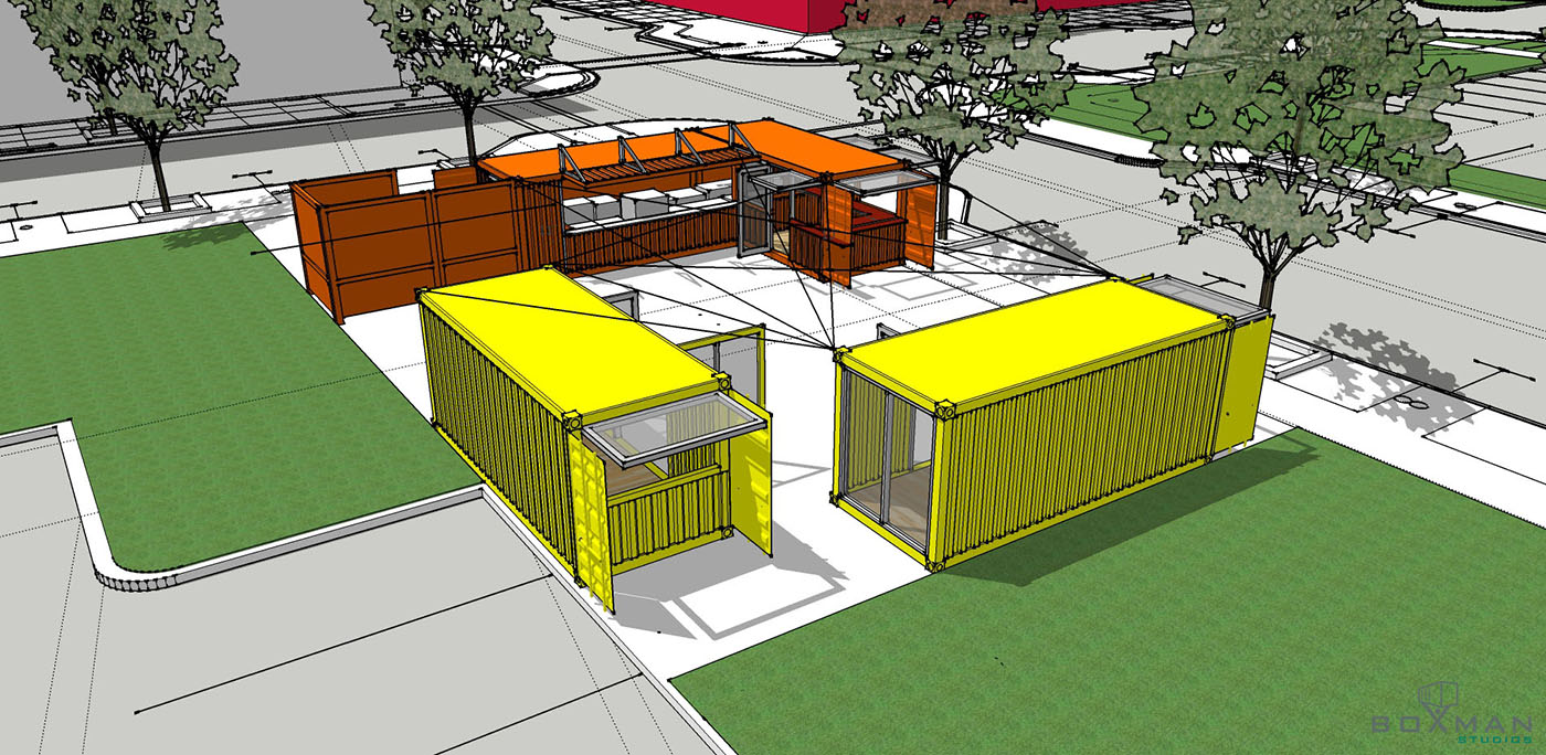 The other two containers will house retail, with steel doors and eight-foot hinged store windows that are easy to open.