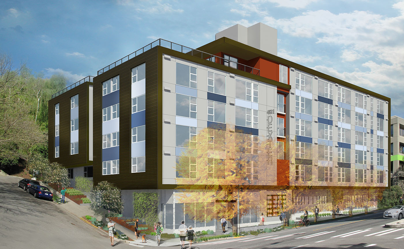 A third example of new, affordable and dense housing comes from Bellwether Housing, which breaks ground Tuesday, Oct. 4 on the 71-unit Anchor Flats at 1511 Dexter Ave. N. Mayor Ed Murray and other dignitaries will attend the event. Bellwether acquired the 16,000-square foot site, previously occupied by a small office building and parking lots, for $1.2 million in 2011. Adjusted to meet area median incomes from $31,000 to $43,000, rents will range from $840 to $1,200, about half the city's current median. The six-story building will have live/work units, studios, and one- and two-bedroom units ranging from 584 to 923 square feet.