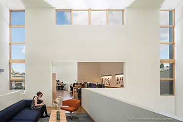 The formerly vacant lot measures only 4,400 square feet, and the new building has 3,600 square feet. The south end of the building is a double-height space, 28-feet-high, lit by sawtoothed, warehouse-style skylights. The wall of windows looks toward Beacon Hill, admitting even more warmth and sunlight. “We hardly ever use our lights,” says the firm's Emily Walker. “I think we run the air conditioning on the hottest days for an hour or two.”