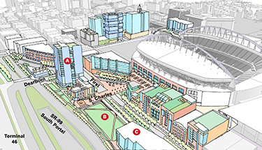 East across First, the row of old industrial and loft buildings is in the Pioneer Square Preservation District's south panhandle, as is the Silver Cloud. Apart from game days, it's a rather sleepy, underutilized area that could well benefit from something, anything across the street. But that would require new zoning, final approval from the city council, a whole new round of Seattle Process — and probably more design charettes.